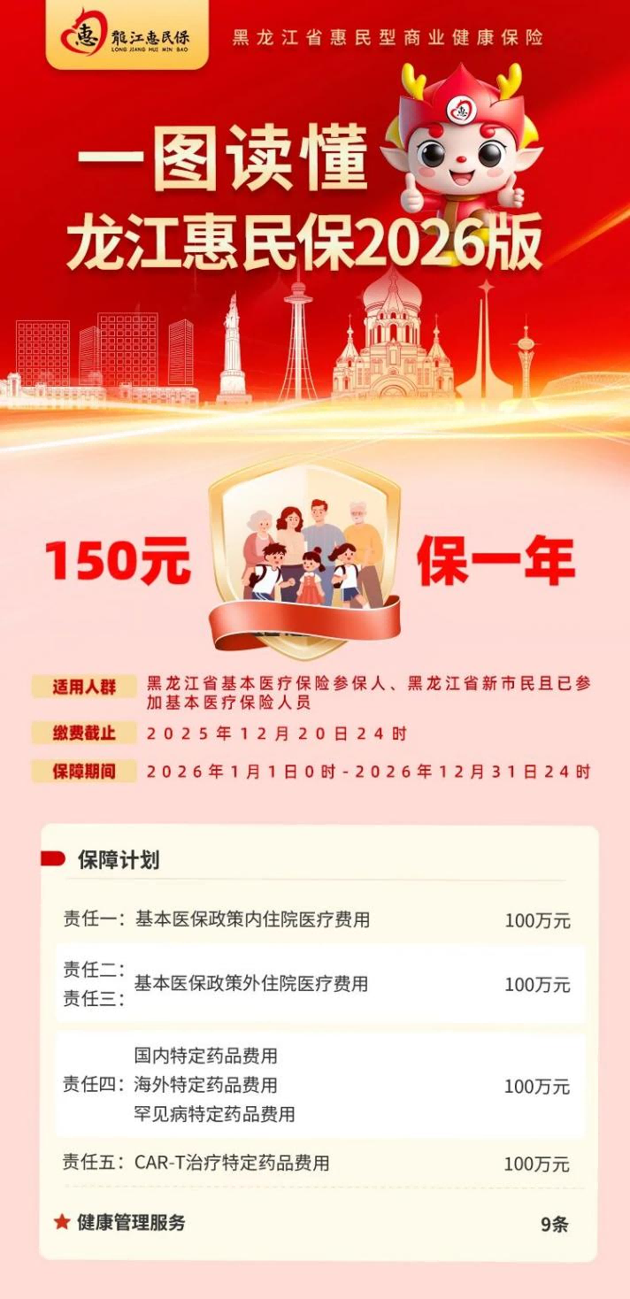 “龙江惠民保2026版”参保通道现已开启!您可通过微信搜索“龙江惠民保”公众号,即可便捷投保。参保截止时间为2025年12月20日24时,保障将覆盖2026年一整年。未雨绸缪,是对家人最好的守护。面对生活中的不确定风险,一份普惠优质的补充保障,能让我们更有底气迎接挑战。诚挚邀请您及家人及时参保,用一份安心托起全家的健康未来。让我们汇聚龙江力量,共同织密健康防护网,守护每一个家庭的幸福安宁。